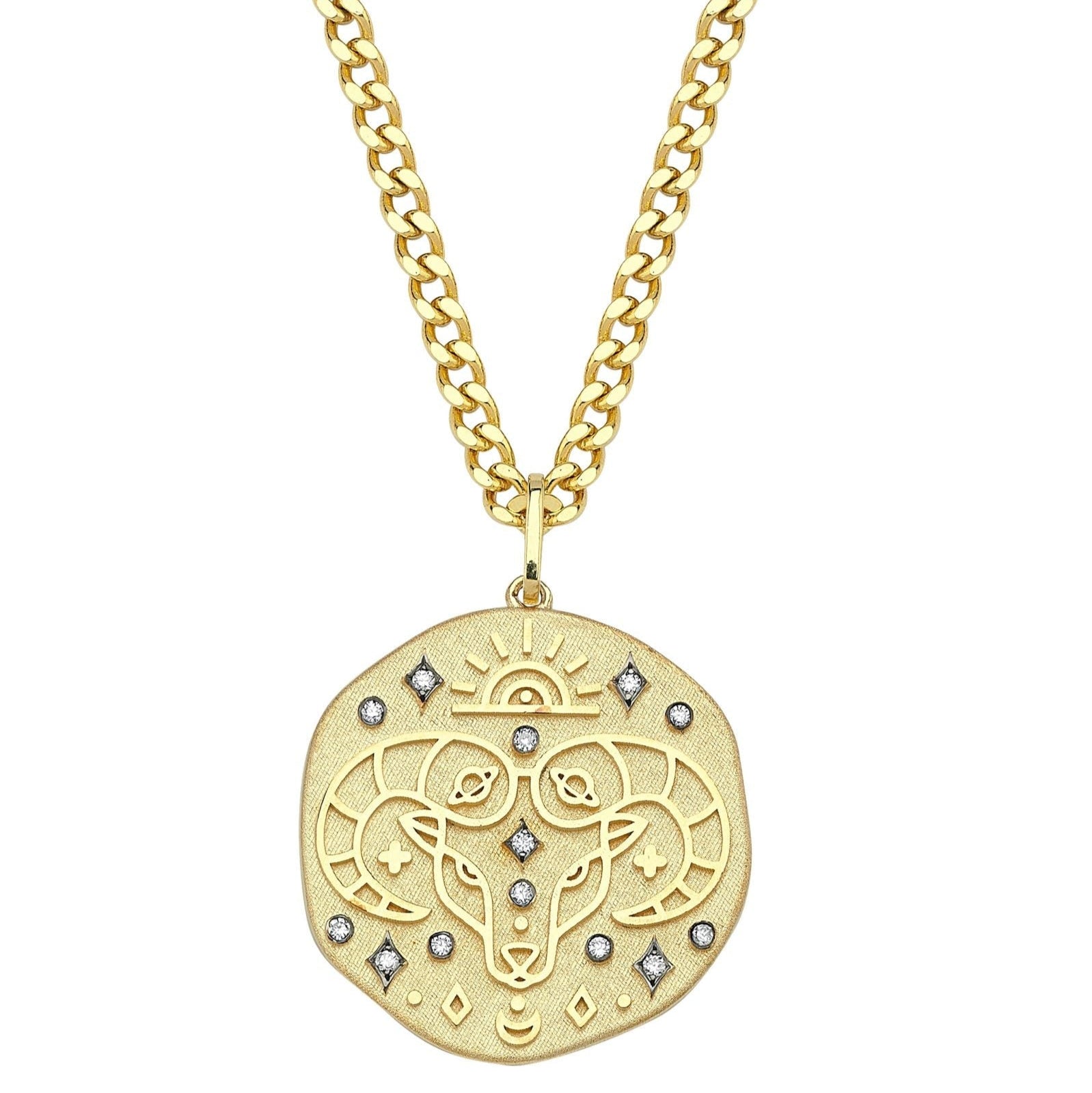 Aries Illustration Zodiac Necklace with Emerald Birthstone, Diamonds & Curb Chain