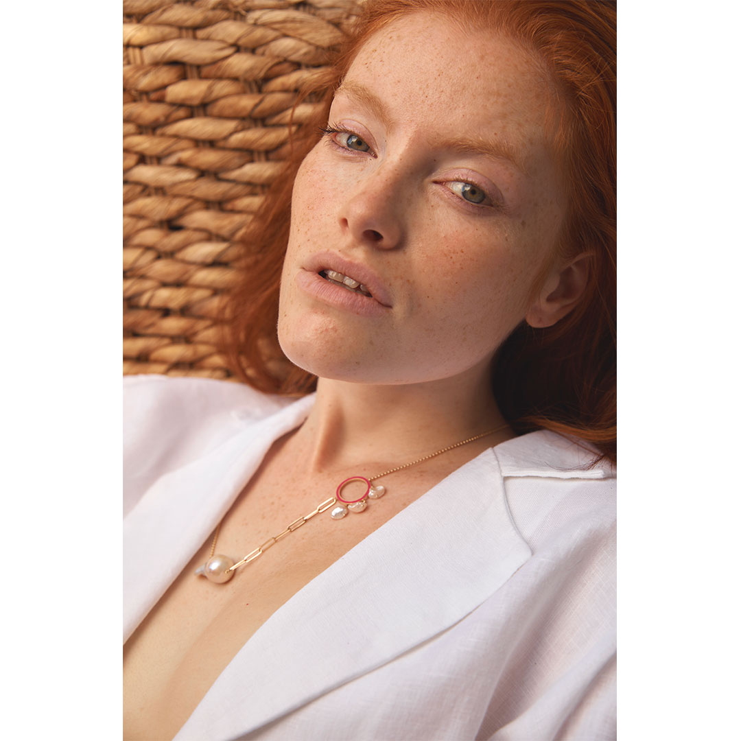 Baroque Pearl Necklace with Double Chain and Pink Enamel