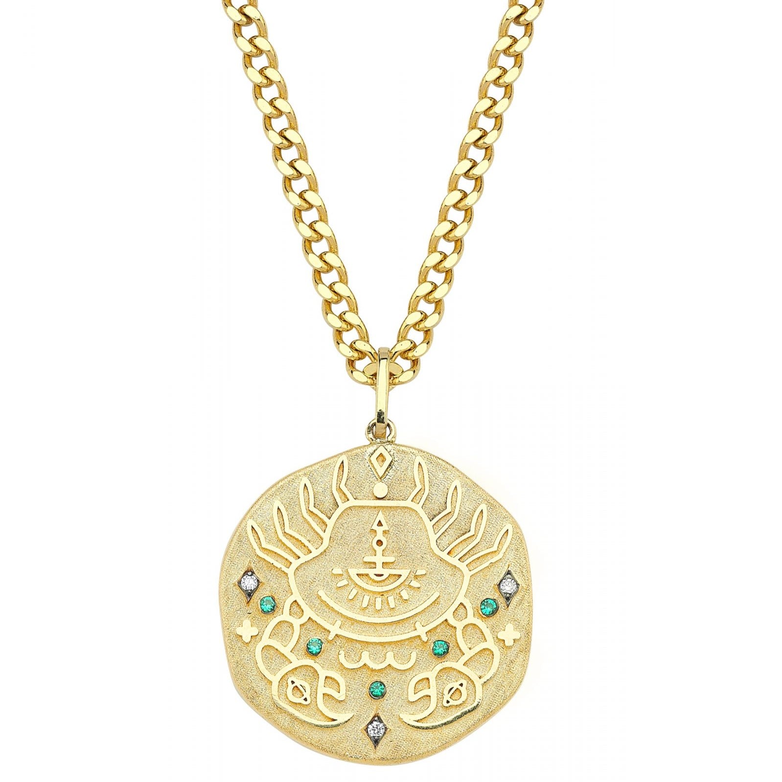 Cancer Illustration Zodiac Necklace with Emerald Birthstone, Diamonds & Curb Chain